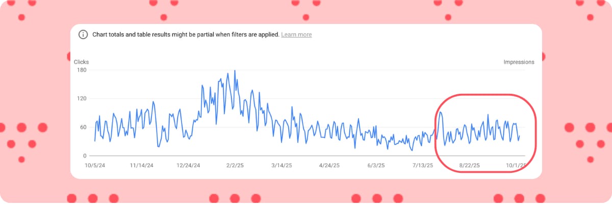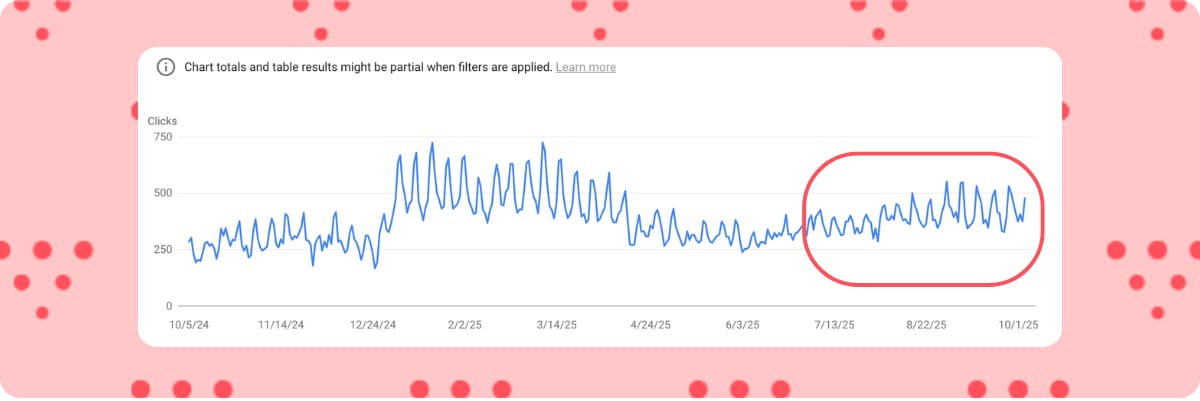 Exhibit C: In late July 2025, a third food blogger trimmed filler from a top post that experienced decline, and organic clicks improved